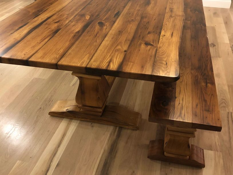 We can custom build a bench to match your table with the same wood on your table top for your bench top and same base style from your table for your bench.